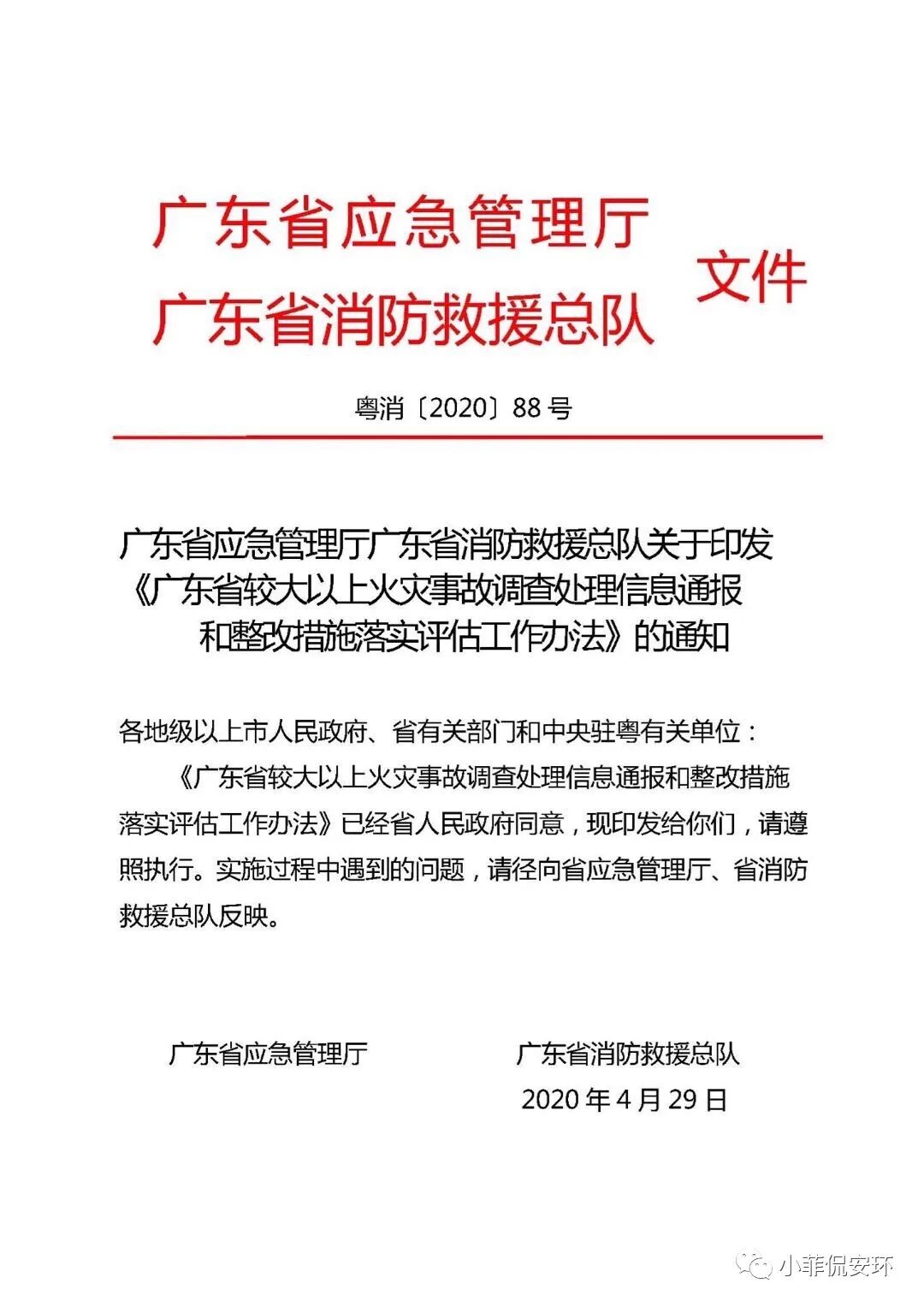 广东省应急管理厅、广东省消防救援总队 关于印发《广东省较大以上火灾事故调查处理信息通报和整改措施落实评估工作办法》的通知 粤消【2020】88号………
