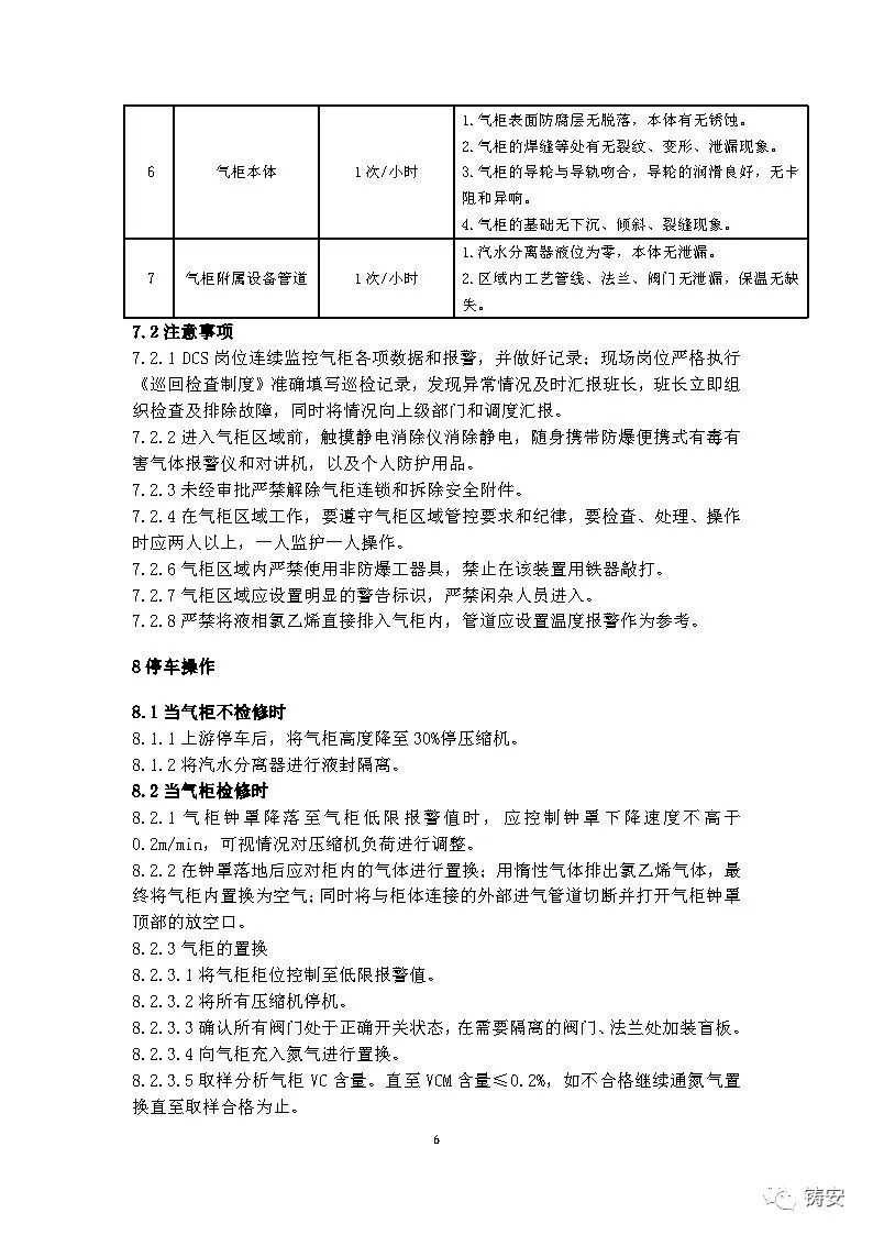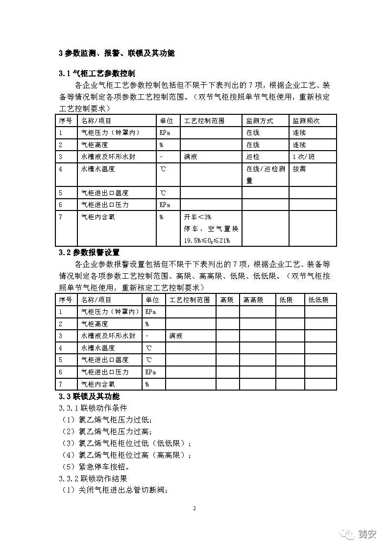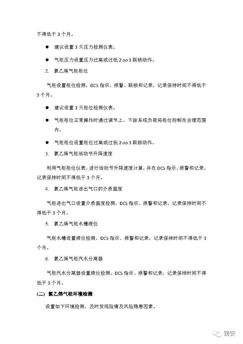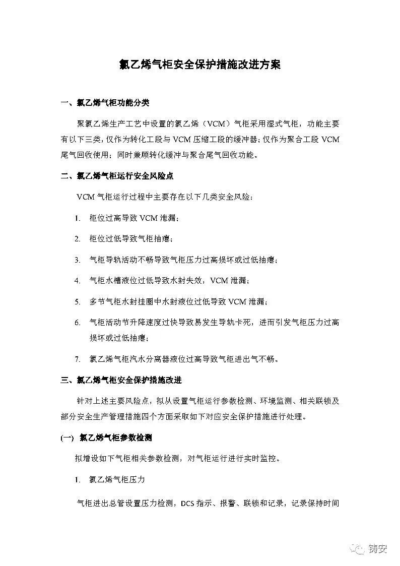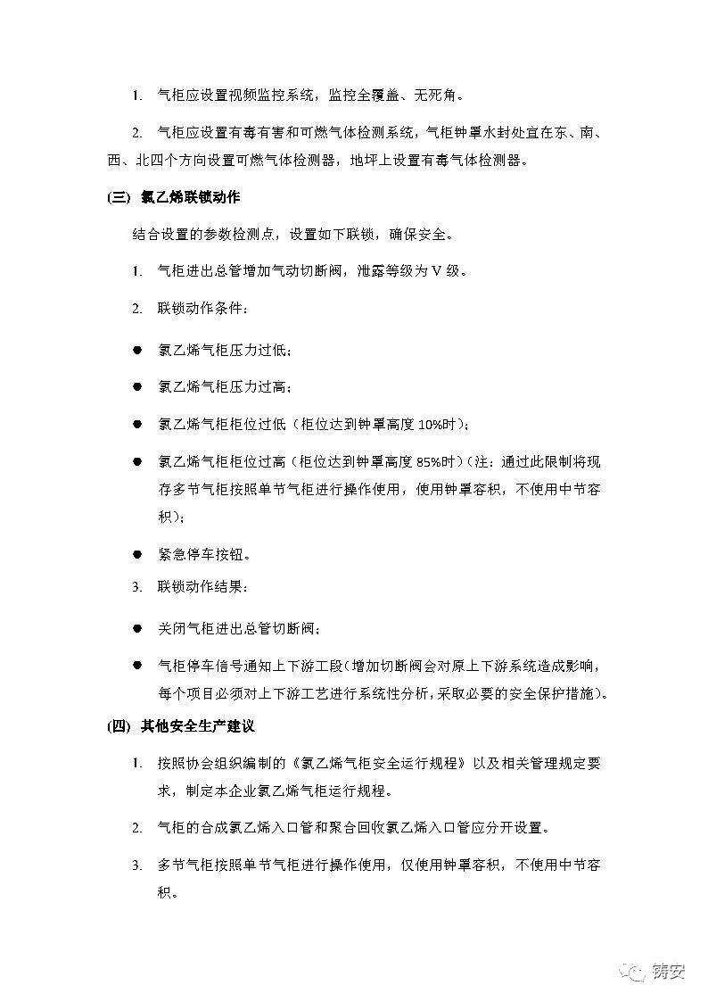 为深刻汲取“11.28”和“4.24”氯乙烯气柜事故教训,进一步完善氯乙烯气柜安全管理,根据应急管理部危化司要求,协会组织编制了《氯乙烯气柜安全运行规程》(见附件1),中国天辰工程有限公司编制了《氯乙烯气柜安全保护措施改进方案》(见附件2),并经过行业专家会议研讨完善,形成发布稿。现下发给各企业,请参照做好相关工作。