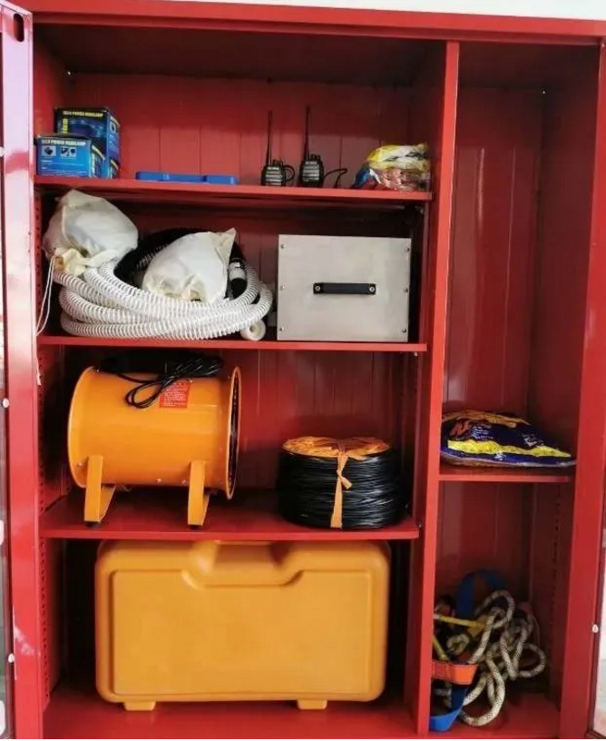 6.应急柜。污水处理设施现场应设置应急柜,便于取用。通讯设备、呼吸器、防毒面罩、安全绳、救生圈、吊救装备等应急救援物资装备应参考《危险化学品单位应急救援物资配备要求》(GB 30077-2013)等国家法规、标准进行配备,并定期检验检测,确保应急器材完好、有效。空气呼吸器等应确保2套以上,应急装备清单应写清应急装备的种类、数量、存放地点。存在缺氧或有毒且无法达到国家标准、或者不易通风换气的有限空间场所,作业时应佩戴隔离式呼吸器;必要时应拴带安全绳,并可靠地固定在有限空间外,便于与监护人员的沟通及救援。