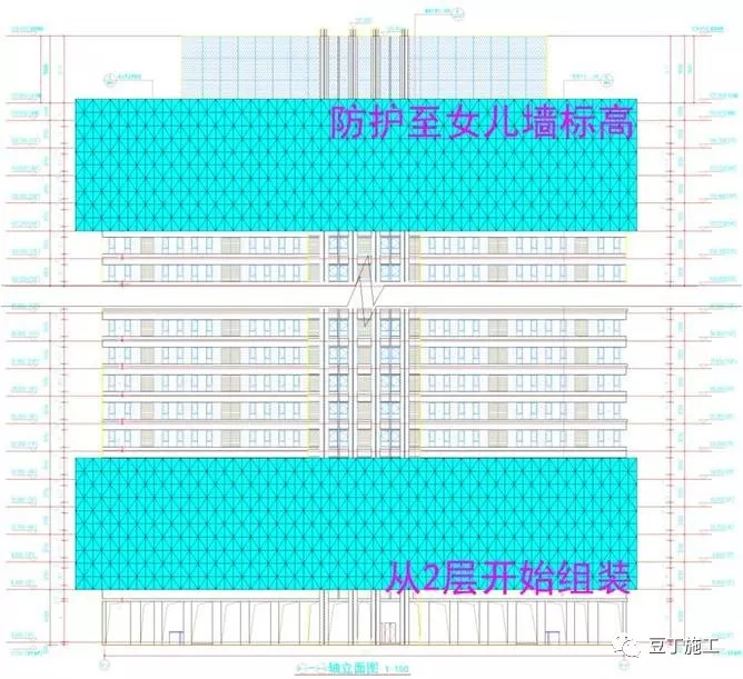 本工程1#、2#公寓楼架体均拟定从2层开始组装折叠式升降脚手架,均防护至女儿墙,如图右所示。