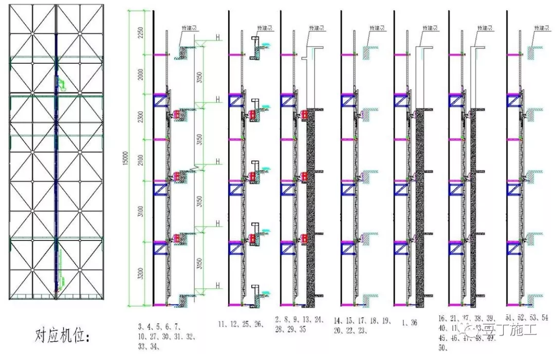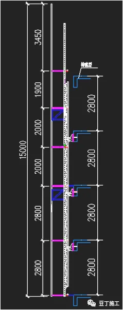 采用15m高的折叠式升降脚手架,共布置了6层走道板,走道板步距从下到上分别为3.2m、3.1m、2.1m、2.3m、2.0m,剩余的2.25m作为防护高度 立面图详见右图。