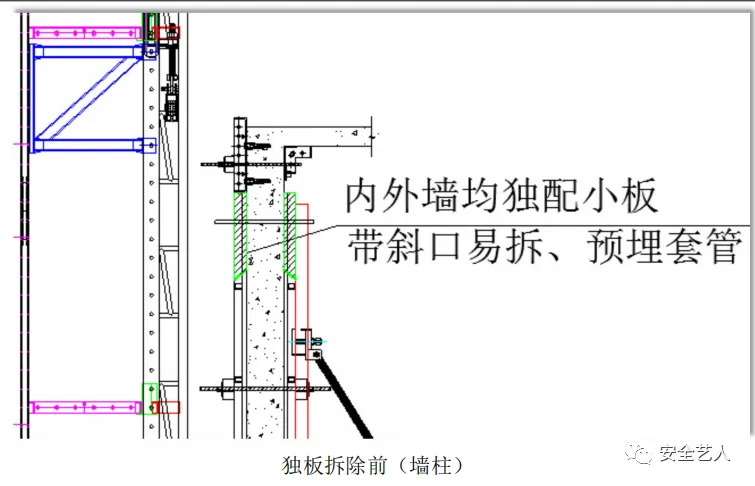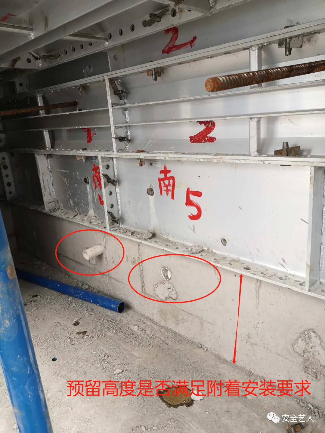 ②飘窗位置。根据飘窗位置空间大小,看是否需要将K板设计成上下两块,混凝土浇筑完成,及时将爬架附着位置下半块K板提前拆除,以安装爬架附着支座。
