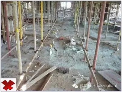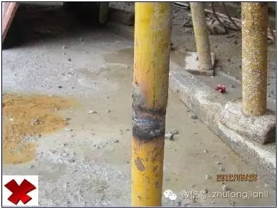 正确做法:支架的支承而为地面时,场地应平整,排水应畅通,地面不应发生沉陷。立杆应采用对接接长,相邻两立杆的接长不应在同一步高内。