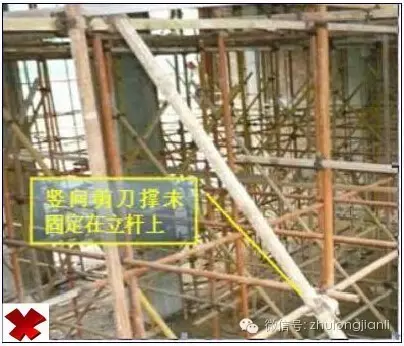 正确做法:竖直剪刀撑应与每一条与其相交的立杆扣接(不直接与竖直剪刀撑斜杆接触的立杆除外)。 可调顶托伸出长度超长;顶托与立杆轴线偏差过大,未垂直支顶除设计图另有规定外,所有垂直支架柱应保证其垂直。螺杆外径与立杆钢管内径的间隙不得大于3mm,安装时应保证上下司心。