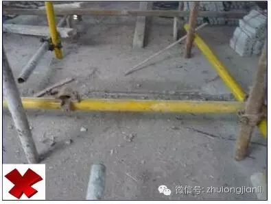 正确做法: 在立杆底距地面200mm高处,沿纵横向设置一道水平拉杆。
