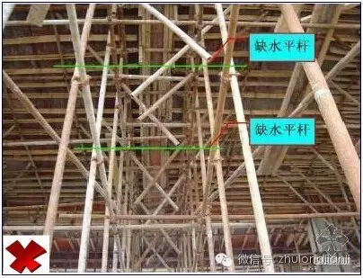 正确做法:水平杆应纵横两向布置,每步高上纵横两向均不应缺杆。