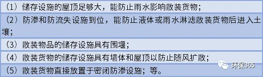 未包装的散装货物在储存和运输过程中如果没有苫盖或其它设施,容易造成土壤污染。经过包装的液体货物在包装受损时容易导致土壤污染,当包装好的固体和粘性货物包装受损时,也可能导致土壤污染,但污染风险一般低于液体货物包装受损时所导致的风险。在散装货物储存过程中采用以下设计和建设,可以降低污染土壤的风险,包括但不限于: