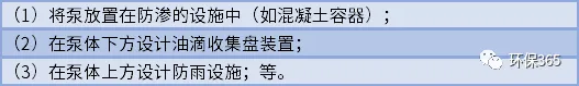 泵传输液体物料时一般和大型储存装置或处理设施相连,操作人员一旦发现泵的故障,及时关闭管道即可防止液体泄漏,降低污染土壤的风险。采用以下设计和建设,可以降低泵传输过程中污染土壤的风险,包括但不限于: