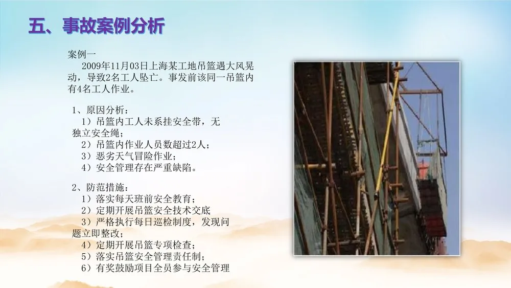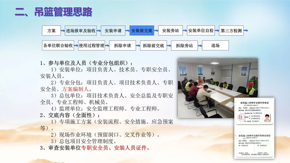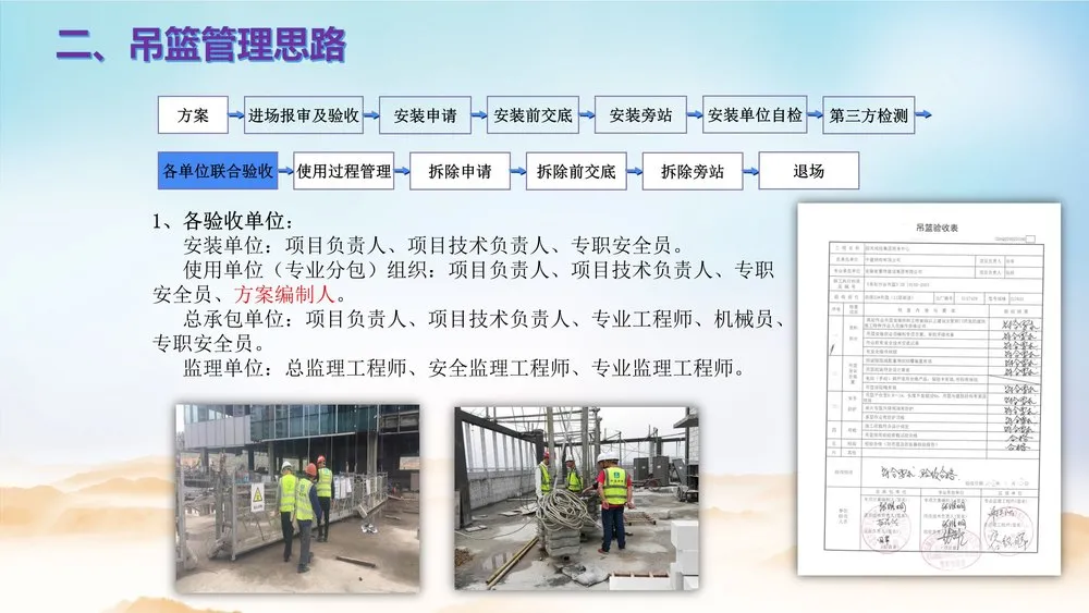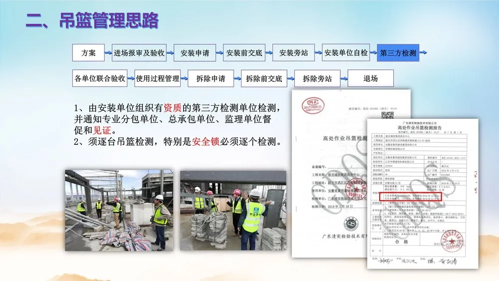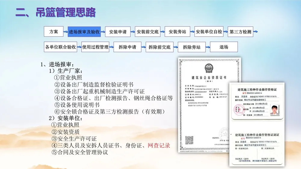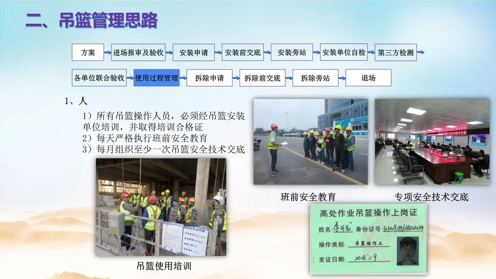 近日,北京市建委就施工高处作业吊篮的安全管理问题,明确答复了北京市建设工程物资协会,解决了很多长期困扰施工单位的问题。吊篮不属于《建筑起重机械安全监督管理规定》中所称的建筑起重机械,其安全监督管理不适用于《建筑起重机械安全监督管理规定》。2、吊篮产权单位从事安装拆卸(二次移位)是否需要取得相关资质和安全生产许可证?吊篮的安装和拆卸(包括二次移位)工作应当由产权单位负责。本市不要求吊篮产权单位取得起重设备安装工程专业资质,也不要求其取得安全生产许可证。3、吊篮产权单位可以作为专业分包单位编制危大工程专项施工方案吗?吊篮产权单位无权作为专业分包单位编制危大工程专项施工方案。涉及吊篮的危大工程,专项施工方案应由施工总承包单位或建筑幕墙工程专业分包单位(建筑幕墙专业分包单位作为使用单位租赁吊篮的)编制。作为施工现场常见设备,吊篮的安全管理必不可少。下面这份吊篮施工安全管理培训PPT供大家参考!