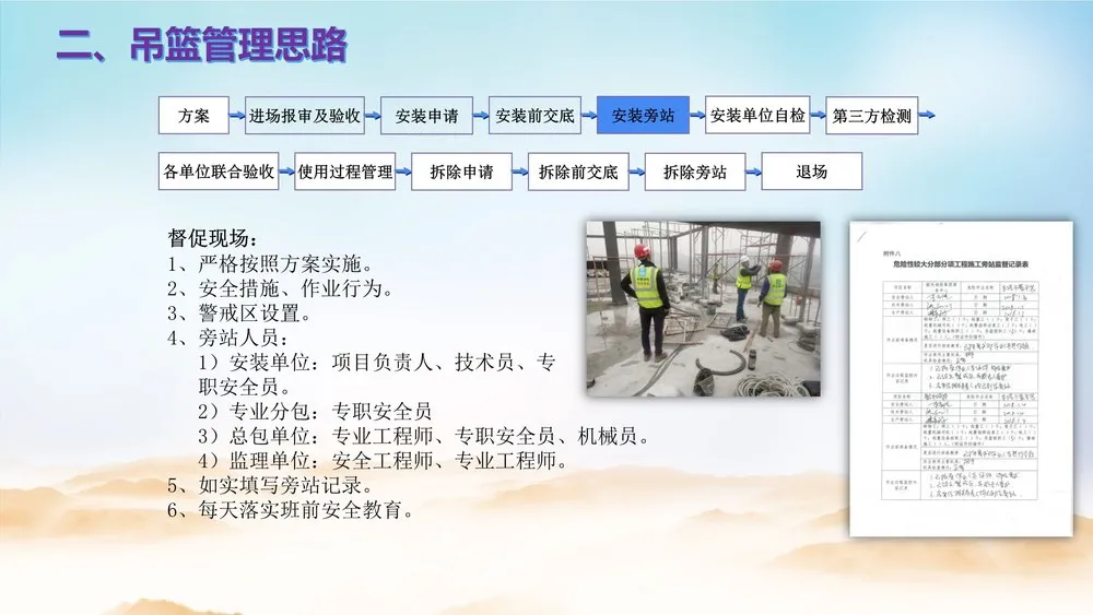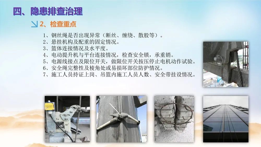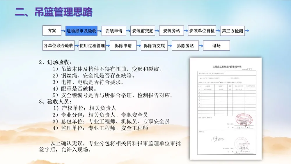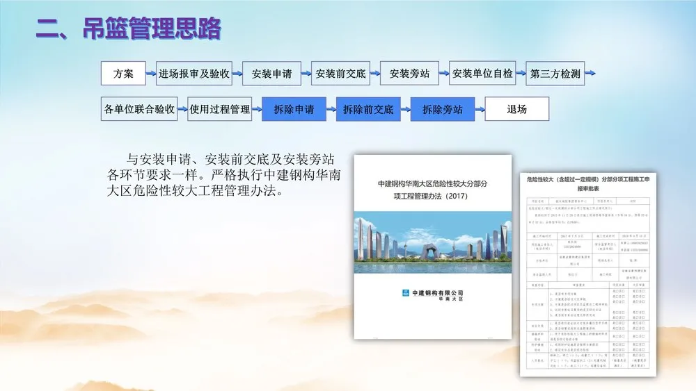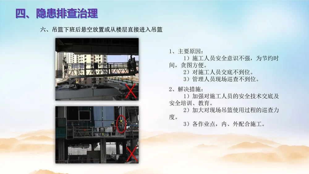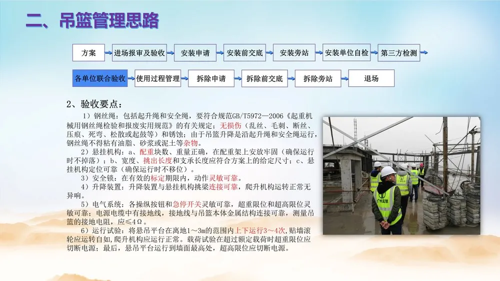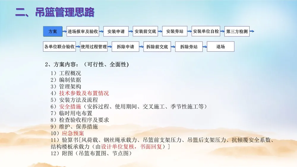 近日,北京市建委就施工高处作业吊篮的安全管理问题,明确答复了北京市建设工程物资协会,解决了很多长期困扰施工单位的问题。吊篮不属于《建筑起重机械安全监督管理规定》中所称的建筑起重机械,其安全监督管理不适用于《建筑起重机械安全监督管理规定》。2、吊篮产权单位从事安装拆卸(二次移位)是否需要取得相关资质和安全生产许可证?吊篮的安装和拆卸(包括二次移位)工作应当由产权单位负责。本市不要求吊篮产权单位取得起重设备安装工程专业资质,也不要求其取得安全生产许可证。3、吊篮产权单位可以作为专业分包单位编制危大工程专项施工方案吗?吊篮产权单位无权作为专业分包单位编制危大工程专项施工方案。涉及吊篮的危大工程,专项施工方案应由施工总承包单位或建筑幕墙工程专业分包单位(建筑幕墙专业分包单位作为使用单位租赁吊篮的)编制。作为施工现场常见设备,吊篮的安全管理必不可少。下面这份吊篮施工安全管理培训PPT供大家参考!