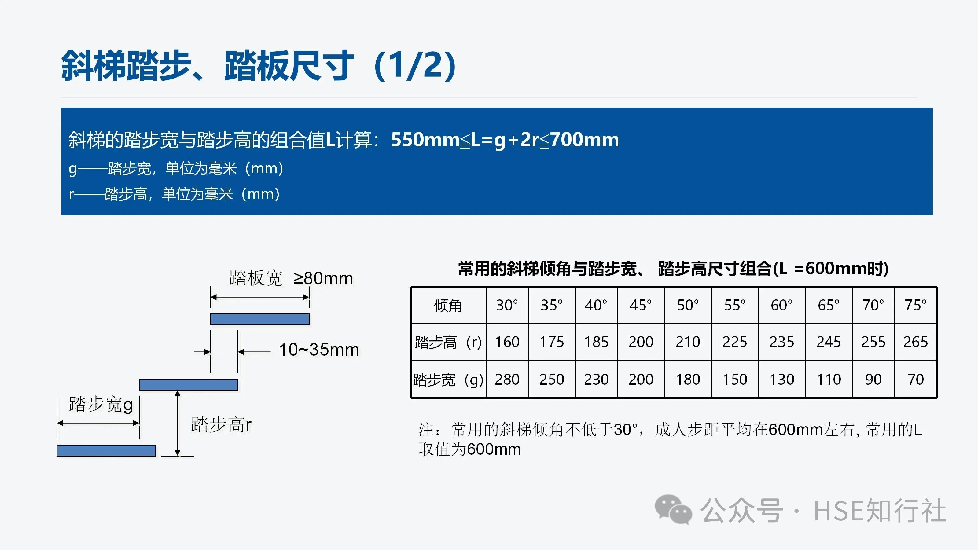 适用范围 适用于工业企业内工作场所中使用的固定式金属斜梯的设计、制造和安装。不适用于安装在核设施、船舶、 起重机械、输电塔上的固定式金属斜梯。 倾角、梯段高度、通行空间、净宽度要求 倾角、梯段高度要求: 梯段高度≤6m;总高度>6m,应分段设梯。 总高度≤6m,不用分段设梯。 通行空间要求: 净空高度:H1≥2000mm,作为疏散通道时,净空高≥2100mm 斜梯坡度线到上方障碍物的最小距离S: 倾角≤45°时, S≥1200mm 倾角>45°时, S≥850mm 斜梯内侧净宽: 偶尔单向通行, 内侧净宽应≥500mm 经常性双向通行, 内侧净宽应≥1000mm 螺旋梯内侧进宽: 内侧净宽应≥650mm 注:“偶尔”指使用频率每年低于30天且每天低于2h。 倾角要求: 优选倾角:30°~35° 经常双向通行最大倾角:38° 偶尔通行的最大倾角:42° 斜梯踏步、踏板尺寸 平台设置要求: 1、斜梯的踏步宽与踏步高的组合值L计算: 550mm≦L=g+2r≦700mm g——踏步宽,单位为毫米(mm) r——踏步高,单位为毫米(mm) 2、常用的斜梯倾角与踏步宽、踏步高尺寸组合(L =600mm时): 倾角 30° 35° 40° 45° 50° 55° 60° 65° 70° 75° 踏步高(r) 160 175 185 200 210 225 235 245 255 265 踏步宽(g) 280 250 230 200 180 150 130 110 90 70 注:常用的斜梯倾角不低于30°,成人步距平均在600mm左右, 常用的L取值为600mm。 3、不同踏板形式的踏板宽度、相邻踏板水平投影长度也不相同,具体如下: 踏板之间封闭: 踏板之间不封闭: 踏板之间不封闭,但踏板有凸起: 非螺旋梯的踏板宽度≥80mm,同一梯段踏板宽度应保持一致。 相邻踏板之间由垂直板件封闭时, 或踏板的踩踏面前方有凸起时, 踏板宽度≥170mm。 相邻踏板水平投影重叠长度: 1、垂直板件封闭时, 重叠长度≥0mm 2、垂直板件未封闭时, 重叠长度10mm~35mm 注:踏板的踩踏面应采用防滑材料或有不小于25mm 宽的防滑突沿,采用花纹板、经防滑处理的金属板、格栅板等。 螺旋梯踏步、踏板尺寸 距离螺旋梯扇形踏步窄边300mm处的踏步宽应不小于170mm。 螺旋梯的踏步高应在160mm~240mm范围内。 螺旋梯同一梯段踏板的平面投影圆心角应保持一致(梯段顶部踏板除外)。 防护栏杆与扶手 防护栏杆设置: 当斜梯侧面敞开边缘的临空高度≥1200mm时, 敞开边缘应设置防护栏杆。 倾角≤45°的斜梯, 防护栏杆立柱应垂直于踏板, 并从第一级踏板起始设置。 倾角>45°的斜梯: 1、防护栏杆立柱垂直于踏板时, 立柱从第一级踏板起始设置。 2、防护栏杆立柱垂直于起坡线时,起始位置设置要满足以下要求: 下方工作面有防护栏时,起点与防护栏顶部横杆连接。 下方工作面无防护栏时,起点距离工作面竖向距离≤1200mm。 立杆垂直于起坡线,下方有护栏 立杆垂直于起坡线,下方无护栏 扶手设置: 扶手设置主要根据斜梯的倾角、斜梯的梯宽来设置,设置要求如下图: 斜梯防护栏杆高度≤1200mm时, 顶部横杆兼做扶手。 单独设置斜梯扶手时, 扶手竖直高度为860mm~1000mm。 扶手起始点距离地面或平台的垂直距离应≤1000mm。 梯间平台与门 梯间平台: 1、梯间平台宽度应不小于梯子宽度, 对斜梯应不小于760mm 。 2、梯间平台在行进方向上的长度应不小于梯子宽度, 对斜梯应不小于850mm。 3、梯间平台要符合GB4053.3—2025的规定。 自闭门: 1、自行关闭、保持在关闭位置但不锁定。 2、采用平开方式向平台内打开、打开角度不小于 90°。 3、关闭时由挡块阻挡,防止人员推开发生坠落或其他意外伤害。 4、不设置踢脚板、底部距离平台高度为120mm~500mm。 5、自闭门要符合GB4053.3—2025的规定。 荷载 梯梁、踏板、顶部横杆、中间杆、立柱荷载如下: 1、梯宽<1200mm 时, 非螺旋梯踏板应承受跨中100mm×100mm 区域上作用≥1.5kN集中活荷载。 2、梯宽梯宽≥1200mm时, 非螺旋梯踏板应承受跨中间隔600mm的两100mm×100mm区域上同时作用≥1.5kN集中活荷载。 3、螺旋梯的踏板应承受靠近外侧边缘100 mm×100mm 区域上作用不小于1.5kN 集中活荷载。 使用说明和警示信息 斜梯的使用说明和警示信息,主要从“斜梯的使用说明”、“斜梯的警示信息”、“自闭门的警示信息”三方面来完善,同时涉及到的安全色和安全标志应符合 GB2894 的规定。 1、斜梯的使用说明,包括但不限以下内容: a) 斜梯、平台的最大允许荷载.。 b) 自闭门的安全使用信息。 c) 维护和检查的要求。 需要设计、制造方提供使用说明。 2、斜梯的警示信息,包括但不限以下内容: a)最大荷载信息(包括允许的最大负载人数、工具和装备等最大附加荷载)。 b)人员攀登时的安全要求(例如当心坠落、必须戴安全帽等)。 3、自闭门的警示信息,包括但不限以下内容: a)禁止倚靠的信息。 b)小心坠落的信息。 c) 提示非通行状态保持关闭。