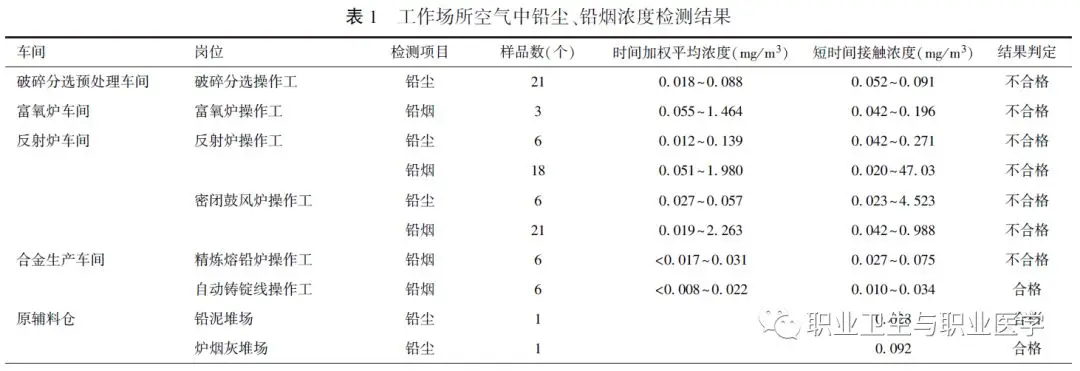 对5个岗位的铅尘、铅烟浓度进行检测,有3个铅尘作业岗位和4个铅烟作业岗位的检测结果超过职业接触限值,铅尘短时间接触浓度最高达4.523mg/m3,超过职业接触限值30倍,铅烟短时间接触浓度最高达47.03mg/m3,超过职业接触限值522倍。铅烟、铅尘检测结果见表1。