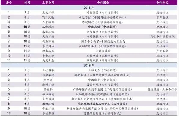 从上表统计可以看出,排名前50的环保企业80%为国企或国资入股。前20的环保企业国企或国资入股的企业数量高达90%!日子该怎么过啊!!!铁汉生态日前发布公告称,为进一步优化公司股东结构,全面提升公司竞争力,推进上市公司战略目标实现,公司控股股东、实际控制人刘水及其一致行动人拟以协议转让的方式向中国节能环保集团有限公司(以下简称“中国节能”)合计转让约10.11%公司股份。同时,公司正在筹划非公开发行股票事宜,中国节能拟以现金认购公司非公开发行新股。在一系列交易完成后,中国节能对铁汉生态的持股比例可能超过20%,并将成为上市公司的控股股东。铁汉生态股票于4月13日开市起停牌。连日来,国资密集入主环保生态企业,引发市场关注。就在3月中旬,中国节能刚刚完成与国祯环保的“联姻”。3月13日,国祯集团宣布终止与长江环保及三峡资本之间的股权转让,转而与中国节能签署股权转让及表决权委托协议,拟将15%的股份转让给中国节能,并将约6.26%表决权委托给中国节能行使。交易完成后,中国节能将拥有国祯环保29.95%的股份表决权,中国节能将成为国祯环保的控股股东。3月11日,碧水源也发布公告称,中交集团拟定增入股成为公司第一大股东,拟认购4.8亿股,占本次非公开发行前公司总股本的15.2%,发行价格为7.72元/股。公开资料显示,中国节能是央企中专业从事环保水务的企业,拥有500余家下属企业,其中二级公司26家,旗下拥有5家上市公司平台:太阳能、节能风电、万润股份、中环装备、中国地能。“三峡系”今年也开始在A股市场“扫货”,虽然其与国祯环保没有达成股权合作,但却相继入股启迪环境旗下雄安浦华水务、兴蓉环境、纳川股份以及上海环境。同时,还进一步增持港股上市公司北控水务,动作不可谓不大。事实上,近两年来,国资与环保行业的民企合资合作非常多,范围几乎覆盖了所有环保产业领域,包括不少民营的环保龙头企业。表:2018年、2019年国企与环保上市公司合作情况汇总而除了入股环保企业以外,国资还以其他多种形式进入环境产业领域。如基建央企中国中铁直接以项目工程为切口进入环境产业领域。4月8日,注册资本10亿元的中铁水务正式成立,成为中国中铁第九大业务板块。全国工商联环境商会秘书长马辉在接受《中国经济周刊》记者采访时介绍,国企进场在2015年前后就已经进入高潮,2017年的时候有所放缓,2019年以来因为很多民企需要纾困等原因,国企进场又开始加速。马辉提到,国企进场分为四种途径,一是为民企纾困而来,加速了产业的逆向混改,主要以四川、浙江等地方国资以及大型央企为主,这一行为是政策性和市场驱动叠加的结果;二是2015年前后为环保市场而来,主要以葛洲坝、中国交建、中国电建、中国中车、中信等大型央企为主,这个是偏市场行为;三是偏政策行为,为国家战略而来,主要以三峡集团为代表;四是近两年又崛起的一批地方环保集团,主要以江苏、河南、陕西等地方国资平台为主。