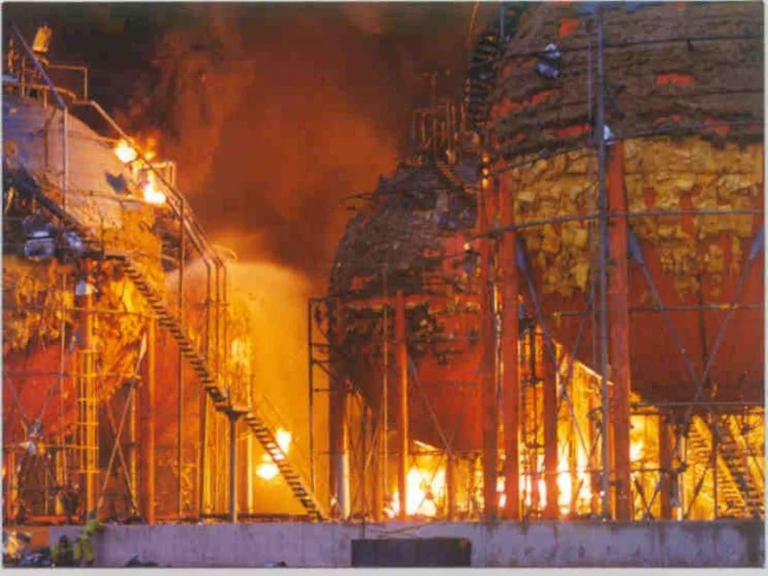 1984年11月19日,墨西哥国家石油公司的液化石油气(LPG)储运站,由于管线破裂,释放出大量LPG,形成蒸汽云后,遇火源着火爆炸。火球直径高达360m,48个储罐全部遭到破坏,站内设施几乎全部毁坏。爆炸冲击波半径达1200m,损毁民房1400多间,共造成约650人死亡,6000人受伤,3万多人无家可归,被列为“世界工业史上最大的灾难之一”。
