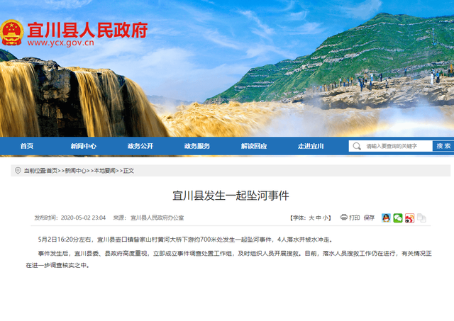 2020年5月2日,陕西宜川县官方发布通告,称在当天16:20分左右,壶口镇发生一起坠河事件,4人落水并被冲走。目前,搜救队还在搜救当中,有关情况还需进一步核实,尚不清楚坠河者是否为游客!