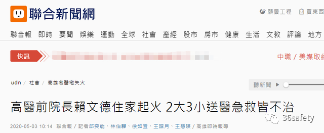 据台湾“中央社”《联合报》等媒体2020年5月3日报道,台湾高雄市三民区大连街一栋5层透天厝今天(3日)发生火灾,消防人员搜救出受困于4层的2名大人、3名儿童,5人全身被熏黑、烧伤,已无呼吸心跳,由救护车紧急送医后宣告不治。