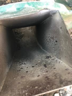 现场打开粉碎机,未发现粉碎机内部存在铁钉、铁丝、刀片等金属异物,粉碎机叶轮无明显变形故障,粉碎机表面无明显剐蹭痕迹,可以排除金属异物进入粉碎机摩擦撞击形成点燃源的可能性。经拆开粉碎机外壳和叶轮,发现粉碎机底部排料口上覆盖的6块筛网大部分面积已被碳化结块物料堵塞,如下图所示,说明事故前粉碎机不能正常排料,导致大量物料在叶片的强烈挤压、摩擦作用下升温、融化并气化,产生了一定的可燃蒸气,被挤压、摩擦的物料升温到一定程度发生闷燃,同时引燃粉碎机腔体内聚集的少量可燃蒸气,燃烧产物(火焰或火星)通过排料管进入粉房,引爆了粉房内达到爆炸浓度的的粉尘云。