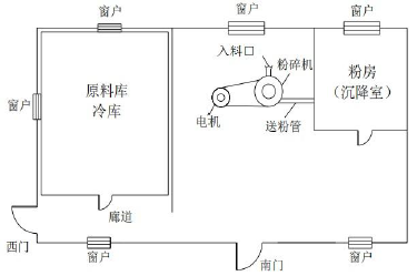 发生事故的建筑物位于厂区东南角,为砖混结构平房,面积为35平方米,分为里外两间,外间内臵冷库,冷库内存储的是原料聚乙烯蜡(呈8mm直径大小的圆片状),数量约1.5吨;冷库门前为通向里间的走廊,里间布臵了粉碎机及粉房,粉房为沉降室结构,四周密闭,北侧有窗(推拉式铝合金窗),南侧有门(外开式铝合金门),此门平时常闭,粉房粉尘堆积过高时需打开此门对堆料进行平整或将产品装袋。