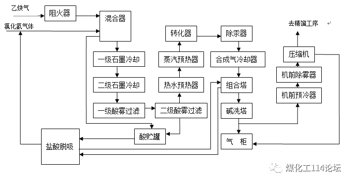 东兴化工公司以电石为原料通过发生器制得乙炔,以电解食盐水产生的氯气和氢气合成制得氯化氢,乙炔与氯化氢通过转化器生成粗氯乙烯单体,水洗、碱洗后,经过气柜气量调节,压缩后送入精馏工序。氯乙烯生产工艺流程见下图。