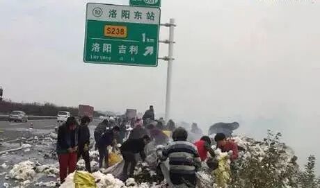 2015年10月30日,连霍高速682公里处洛阳市段,一辆货车轮胎着火引燃车上的棉花。很快,消防队员赶到现场进行紧急灭火。而随后赶来的还有附近村民,但是这些村民却不是来帮忙灭火的,而是来哄抢棉花的,有些甚至不顾消防队员的阻拦,将正在燃烧的棉花抱走。