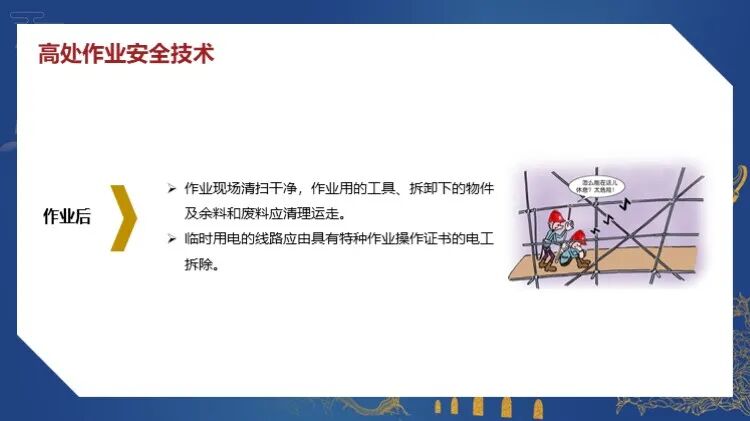 1 | 电气线路 | 已拆除的模板、木方、模板支撑材料、钢管等全部集中堆放于现场指定地点,钢管可及时退还,以上材料严禁有散落于楼层内的,避免因风雪而使以上材料飘落于建筑外,发生安全事故。 |