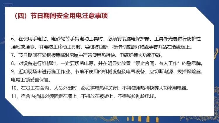 15 | 施工现场临时用电线路及用电设备维护 | 施工现场临时用电由专职电工进行全面检修,所有生产用电及职工宿舍全部拉闸断电,仅保留越冬维护人员办公、生活房间及现场照明用电,其二级配电箱及开关箱必须上锁。施工用二级配电箱及开关箱均拆除,存放在库房内。所有未拆除的配电箱必须进行防雨雪防护。 |