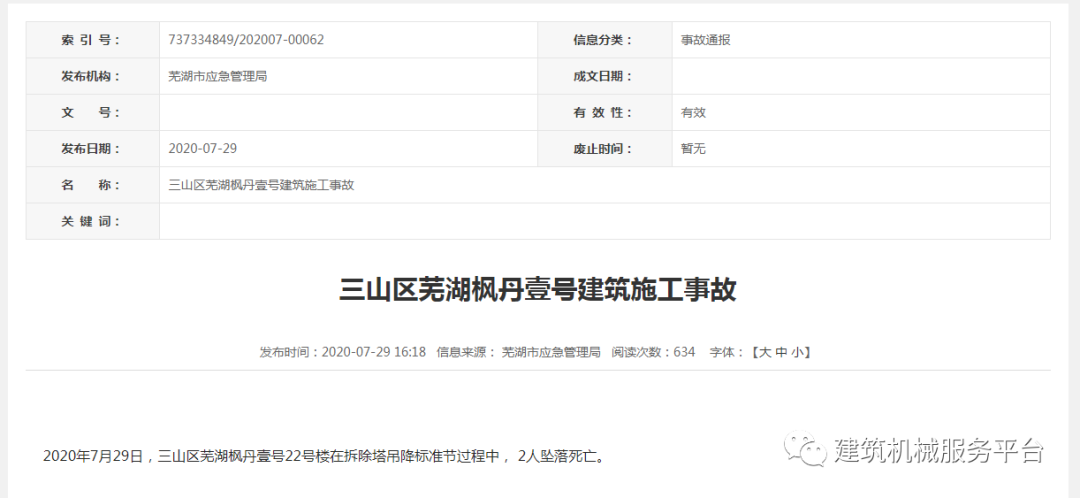 据安徽省芜湖市政府网事故通报:2020年7月29日,三山区芜湖枫丹壹号22号楼在拆除塔吊降标准节过程中, 2人坠落死亡。安全生产人人有责、严禁超载违章作业,加强塔机安全隐患排查。