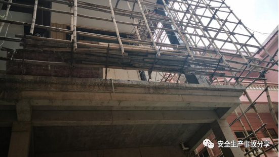 目前,民房主体业已建成,当下处于外墙装修阶段,其四周布满竹脚手架(如图1所示),从二楼一直搭设到九楼。事故民房的结构是逢双层设置阳台,逢单层没有设置阳台,在离阳台边约0.2m处四周又设有一条高约0.2m、宽约0.4m的水泥槛。