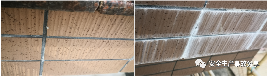 2.季南起坠位置的认定。陈志坚在八楼阳台指认,季南事发时站在八楼外墙竹脚手架中部的横杆上对八楼檐边进行清洗(如图4所示),此处到八楼地面的高度约为1.5m,其站立的位置没有脚手板。事故民房八楼檐边有一条从八楼天台上往檐边下延伸的水管,长度在檐边下方约0.65m(如图5所示)。经对已清洗过的外墙(如图6左侧所示)和未清洗过的外墙(如图6右侧所示)进行比对,专家组推断,事故民房八楼檐边是季南清洗过的,因此,事发时季南所站立的位置为红圈处(如图4红圈处所示)。