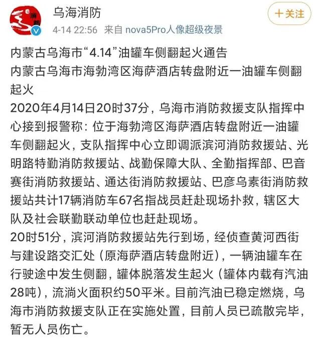 当天晚上,乌海消防发布通告,14日20时37分,乌海市消防救援支队指挥中心接到报警称:位于海勃湾区海萨酒店转盘附近一油罐车侧翻起火,支队指挥中心立即调派滨河消防救援站、光明路特勤消防救援站、战勤保障大队、全勤指挥部、巴音赛街消防救援站、通达街消防救援站、巴彦乌素街消防救援站共计17辆消防车67名指战员赶赴现场扑救,辖区大队及社会联勤联动单位也赶赴现场。