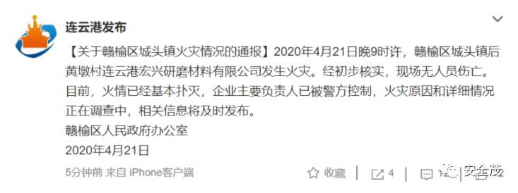 江苏省连云港市赣榆区人民政府办公室发布“关于赣榆区城头镇火灾情况的通报”。通报称,4月21日晚9时许,赣榆区城头镇后黄墩村连云港宏兴研磨材料有限公司发生火灾。经初步核实,现场无人员伤亡。目前,火情已经基本扑灭,企业主要负责人已被警方控制,火灾原因和详细情况正在调查中,相关信息将及时发布。