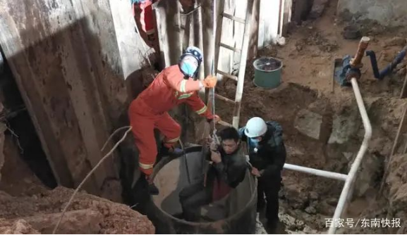 为尽快救出被困人员,现场救援人员决定从管道另一端平地向下挖掘,并对管道进行切割进入救援。3台大型挖掘设备采取边开挖边加固的方式,垂直向下掘进近4米,在近两个小时的时间里挖出了一个长宽各5米左右的救援坑道,并对坑壁四周进行了全面加固。