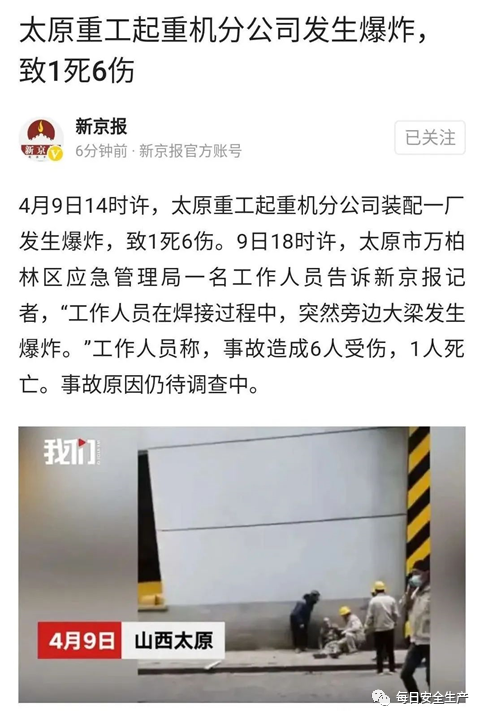 突发事故通报:4月9日14时许,太原重工起重机分公司装配一厂发生爆炸,致1死6伤。