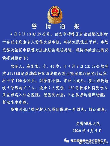 4月9日13时19分左右,一辆越野车沿友谊西路由西向东行驶经过边家村十字100余米后,因操作不慎,车冲上道沿,撞上路边地铁5号线施工工人,造成7人受伤。