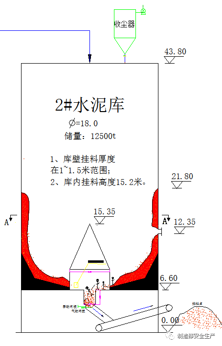 3、在库底减压锥内清理积料时,要在出料口设置安全防护措施,保持应急通道畅通,库底下方设置专人监护。