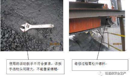 直接原因:当事人使用活动扳手欲松开除铁器皮带螺栓时,没有控制好力度,扳手打滑,右手大拇指插入除铁器框架内受伤。