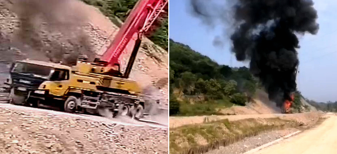 视频中得下一幕,整辆吊车燃起熊熊大火,可谓是损失惨重,目前是否有伤亡情况还未清楚,有了解的吊友可以在留言区交流!