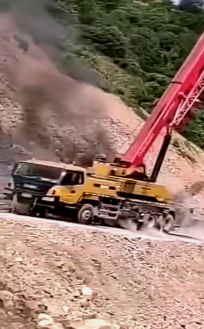 吊臂不慎刮擦到上方的高压导线,可以看到上方高压线与吊臂的接触点火光四射,三一吊车一瞬间冒起了浓烟。
