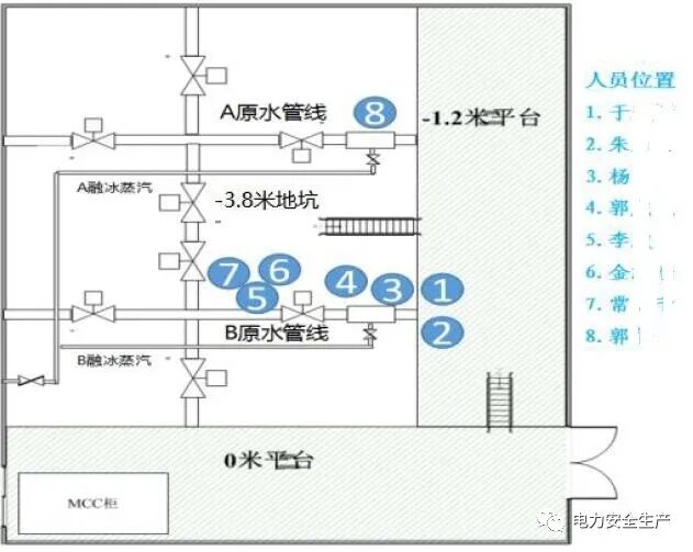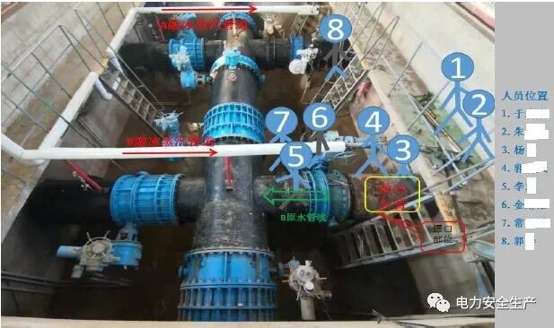 10时18分,净化站B原水管线调节阀回装完毕(未送电),在手动调试阀门机械限位过程中,B原水管线调节阀前融冰装置焊口崩开,原水管线内部汽水混合物大量喷出,造成旁边工作的8名工作人员不同程度烫伤,其中沈阳北方建设检修有限公司6人,石嘴山公司2人。