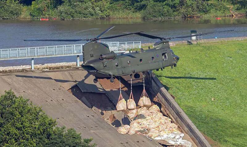 2019年8月1日,受上游强降雨影响,英国德比郡Toddbrook水库大坝辅助溢洪道局部发生严重破坏,导致其下游Whaley Bridge镇约1 500名居民紧急疏散。英国空军直升机紧急投放了530吨砂石包,地面抢修人员用混凝土和砂石包填堵溢洪道空洞。