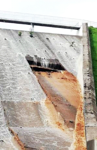 事故发生后紧急修补 Toddbrook水库建于1837~1840年,位于德比郡高山地区Whaley Bridge镇西南方向约0.5 km处。该水库大坝为土坝,高24 m,长约310 m,坝顶宽度约5 m,库容128.8万m3。坝体左侧为主溢流堰, 1964年由于极端降雨曾遭到破坏;为增加溢流量,于1969 ~ 1970年在土坝上新建了辅助溢洪道,长76 m,堰顶高程比主溢洪道高0.26 m,即此次发生事故的溢洪道。该水库根据1975年颁布的《水库法》规定划为A类水库,对下游具有潜在高风险,因此需要进行定期检查。 大坝位置及其主要结构 报告称,虽然本次事故中上游连续两次强降雨,但洪水远小于设计取用的可能最大洪水。专家组认为,溢洪道设计不合理及不定期维护是失事的主要原因。溢洪道顶部和坝体心墙之间缺乏有效的齿墙,使得水可进入泄槽底板下方侵蚀坝体填土。此外,不时观察到顶部施工缝的渗水沿溢洪道流下,这很可能会渗入未安装止水带且未定期维护的纵向接缝。由渗漏水引起的侵蚀可能导致溢洪道泄槽沉降并开裂,卫星数据显示,沉降在破坏之前已经加速。但没有证据显示,这一过程会造成泄槽下方的巨大空洞,破坏的泄槽底板随后塌陷在空洞中。辅助溢洪道坍塌过程中,下部大约800 t(400 m3)的坝体材料被冲蚀到下游河流中。检查工程师在事故发生前,于2019年4月提交了该大坝的2018年检查报告,该报告正确识别了该溢洪道风险,并提出了永久性的消缺处理建议,但未提示风险的紧急性,也未提出采取诸如降低水位等的预防措施。不幸的是,在全面维修工作开始前,该溢洪道破坏事故就发生了。监督工程师表示,他完全依赖于检查工程师的意见,并定期向业主报告水库及其维护状况,不止一次报告了该溢洪道维护工作尚未完成。 2019年7月31日泄洪流量达到最大值 第一块泄槽底板塌陷 溢洪道泄槽破坏的最终形态,其旁侧泄槽壁发生基础淘蚀 根据调查,水库业主运河与河流信托组织(CRT)自2012年负责该水库以来一直遵守法律,因此环境署(水库监管机构)也没有发布任何强制执行通知。但合规并不代表一定安全,此次事件即表明了,水库及其业主遵守了法律,却未能保证水库的安全。 近日,英国政府接受了报告提出的建议,包括:加强检查制度的落实,提高水库安全性,防止此类事件再次发生;提高环境署作为监管者的职权,加强水库法定维护;提高水库业主和工程师对溢洪道结构破坏的认识等。同时报告还提议对当前立法框架颁布实施细则或进行修订。
