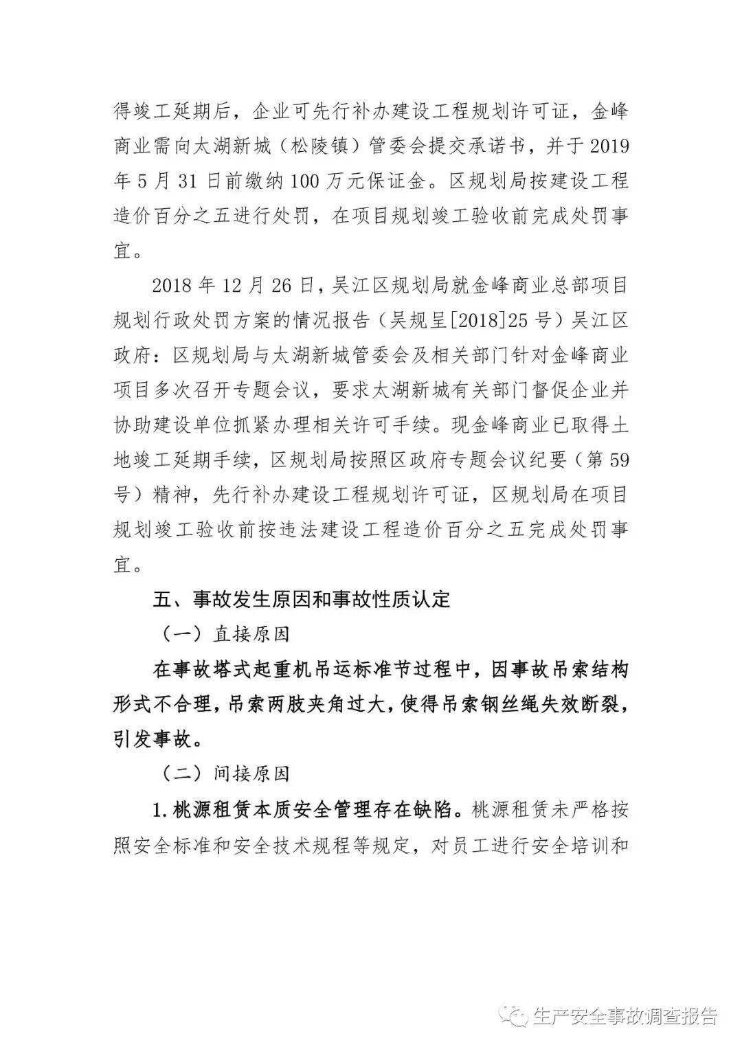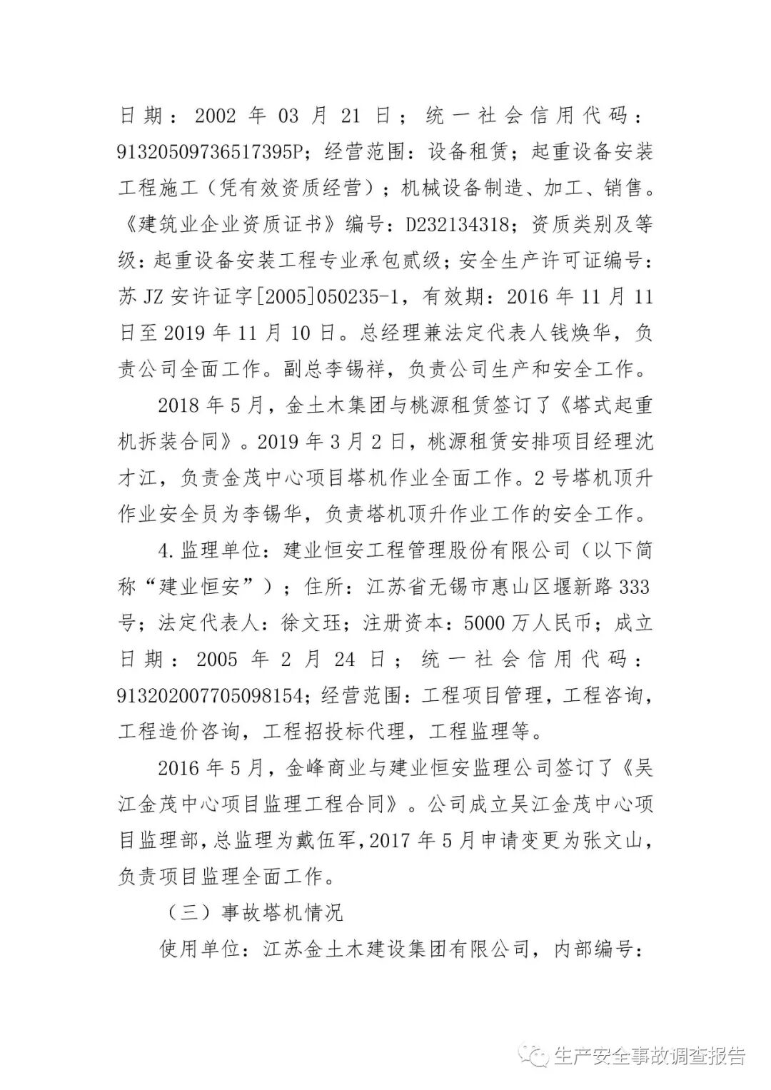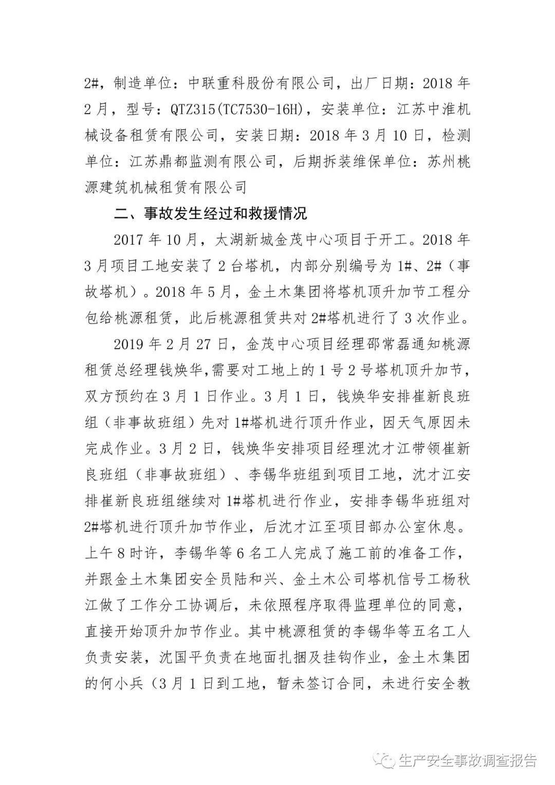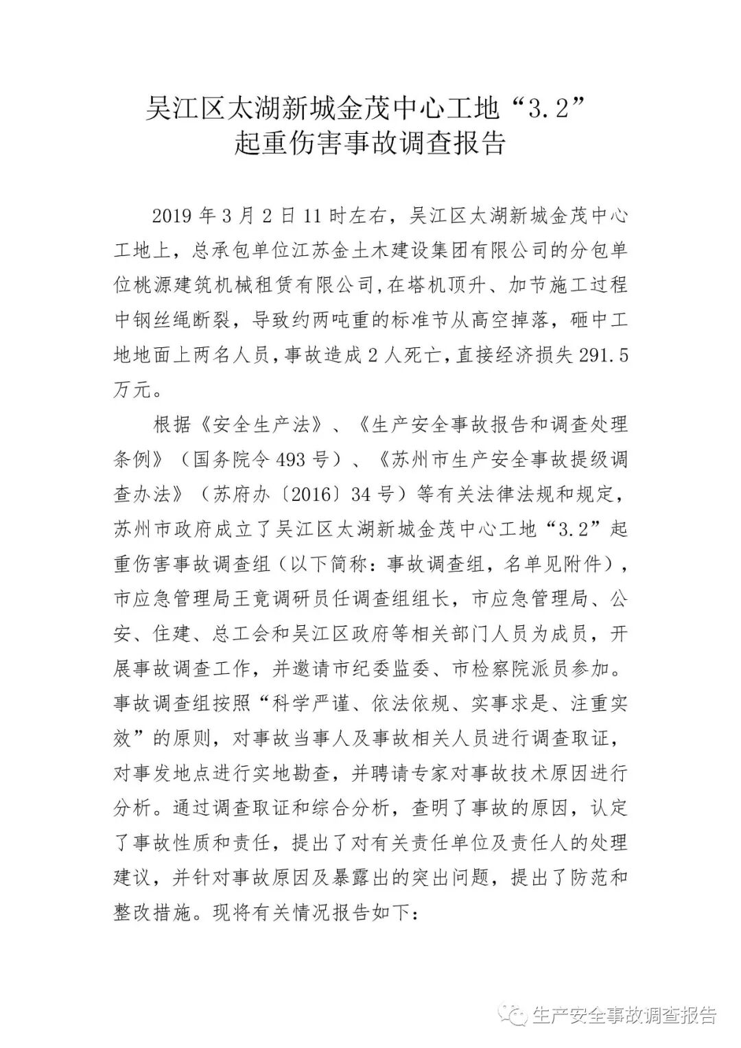 2019年10月15日,苏州市应急管理局官网发布《吴江区太湖新城金茂中心工地“3.2”起重伤害事故调查报告》。报告全文如下