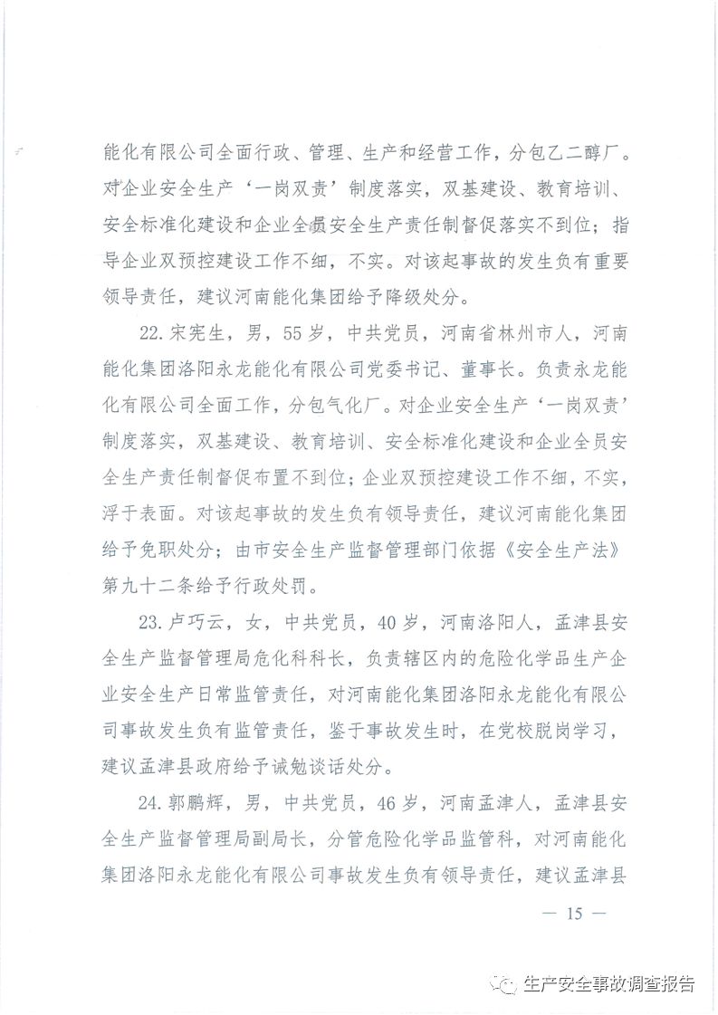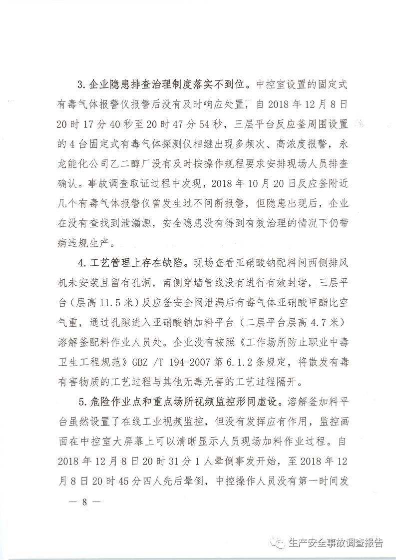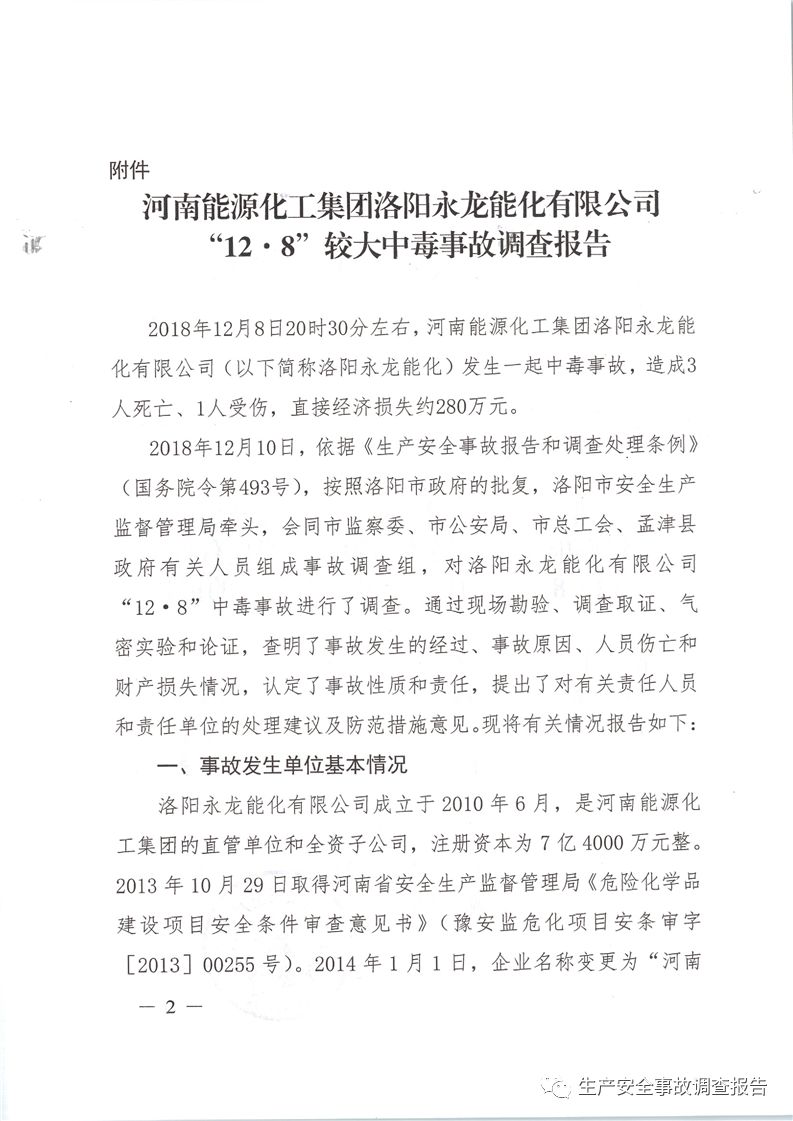 2019年4月9日,河南省应急管理厅官网发布《河南能源化工集团洛阳永龙能化有限公司“12·8”较大中毒事故调查报告》。报告全文如下: