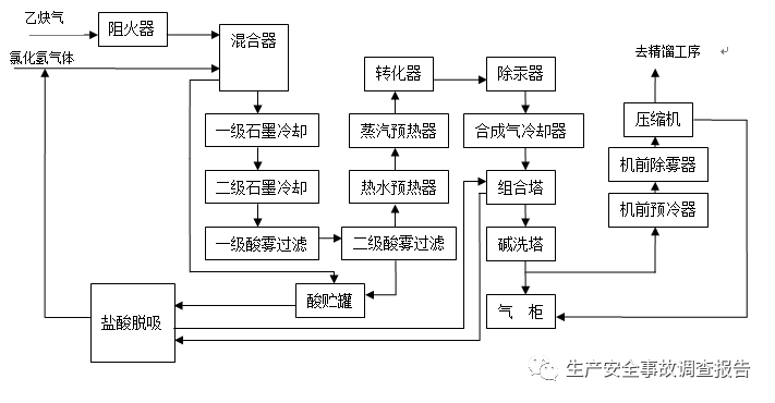 东兴化工公司以电石为原料通过发生器制得乙炔,以电解食盐水产生的氯气和氢气合成制得氯化氢,乙炔与氯化氢通过转化器生成粗氯乙烯单体,水洗、碱洗后,经过气柜气量调节,压缩后送入精馏工序。氯乙烯生产工艺流程见下图。
