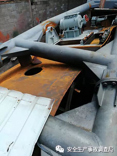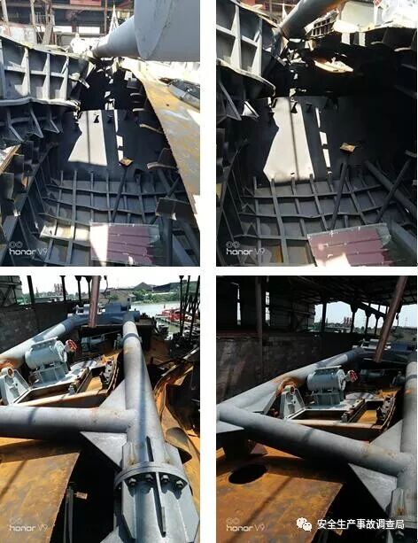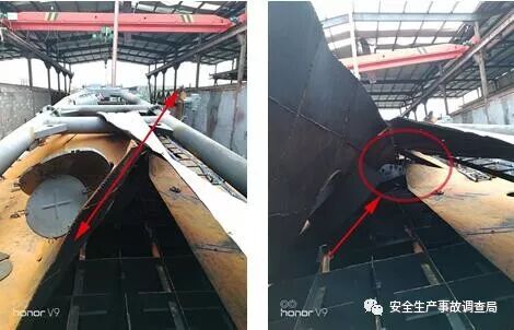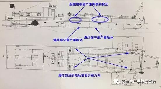 通过对现场人员受伤害位置、船体、轻质屋顶以及隔墙等的破坏程度,参考下面的图1,图中圈出来的两节船舱破坏最严重,如下图2所示,此两节船舱上表面有一根从机舱开始到船头的打捞杆,打捞杆呈梯形,两端固定在船上,从船尾到船头呈现一定的角度,中间部分横向架设在预设好半圆形凹槽口里,半圆形状凹槽口位于两节破坏最为严重的中间部分,即下图两个椭圆中间部位,爆炸后此处可以明显看出,打捞杆被抬起又落下,如下图3所示。