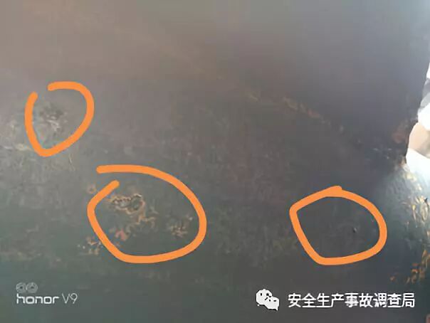 通过视频、相关口供以及现场焊条和气瓶等来分析,现场进行了气焊作业,另外通过现场观察,在确定的初始爆炸点范围内,在船舱体上表面有一个与舱体内部相通的人孔,距离人孔大约2-3m范围内,可以在打捞杆下表面找到焊点,如下图15所示,而且相关口供也证明受伤人员有一名仰卧在存在焊点的打捞杆下方,证明在此处进行了焊接打捞杆上的扶梯工作,因此焊接过程中,存在火花通过人孔落入达到爆炸极限船舱内部的可能性,因此,气焊产生的火花点火源无法排除,并且可能性非常大。除了上述几类点火源,现场其他电器火源以及静电等可能的点火源产生的可能性更小,在此不做具体分析,可以排除,因此通过分析来看,进行气焊产生的电火花成为点火源的可能性最高。