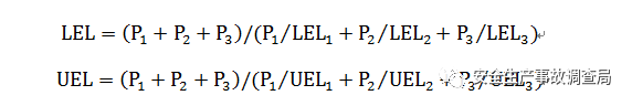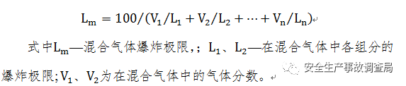 理查特里定律。理查特里认为,复杂组成的可燃气体或蒸气混合的爆炸极限,可根据各组分已知的爆炸极限按下式求之。该式适用于各组分间不反应、燃烧时无催化作用的可燃气体混合物。