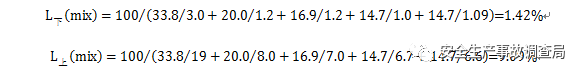 此外还需要对五种气体所占空间体积分数进行分析。前面表7中可以得到每种气体单位质量挥发出来的含量分别为乙醇(2mg/g)、苯(2mg/g)、甲苯(3mg/g)、乙苯(69mg/g)、二甲苯(185mg/g),三种气体分子量分别为46、78、92、106、106。根据气体状态平衡方程,可得到五种气体的体积分数分别为,33.8%、20.0%、16.9%、14.7%、14.7%。因为这几种爆炸性气体相互之间不会发生反应,所以选取理查特里定律进行计算。混合气体的爆炸上下限计算如下。