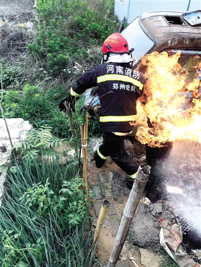 本报讯(记者 汪永森/文 通讯员 杜安东/图)6月17日,郑州西区一场火灾的处置现场,中原区消防大队的一位消防员将一个仍在熊熊燃烧的煤气罐抢出火场,用生命“抱火”扑救引来一片赞叹。